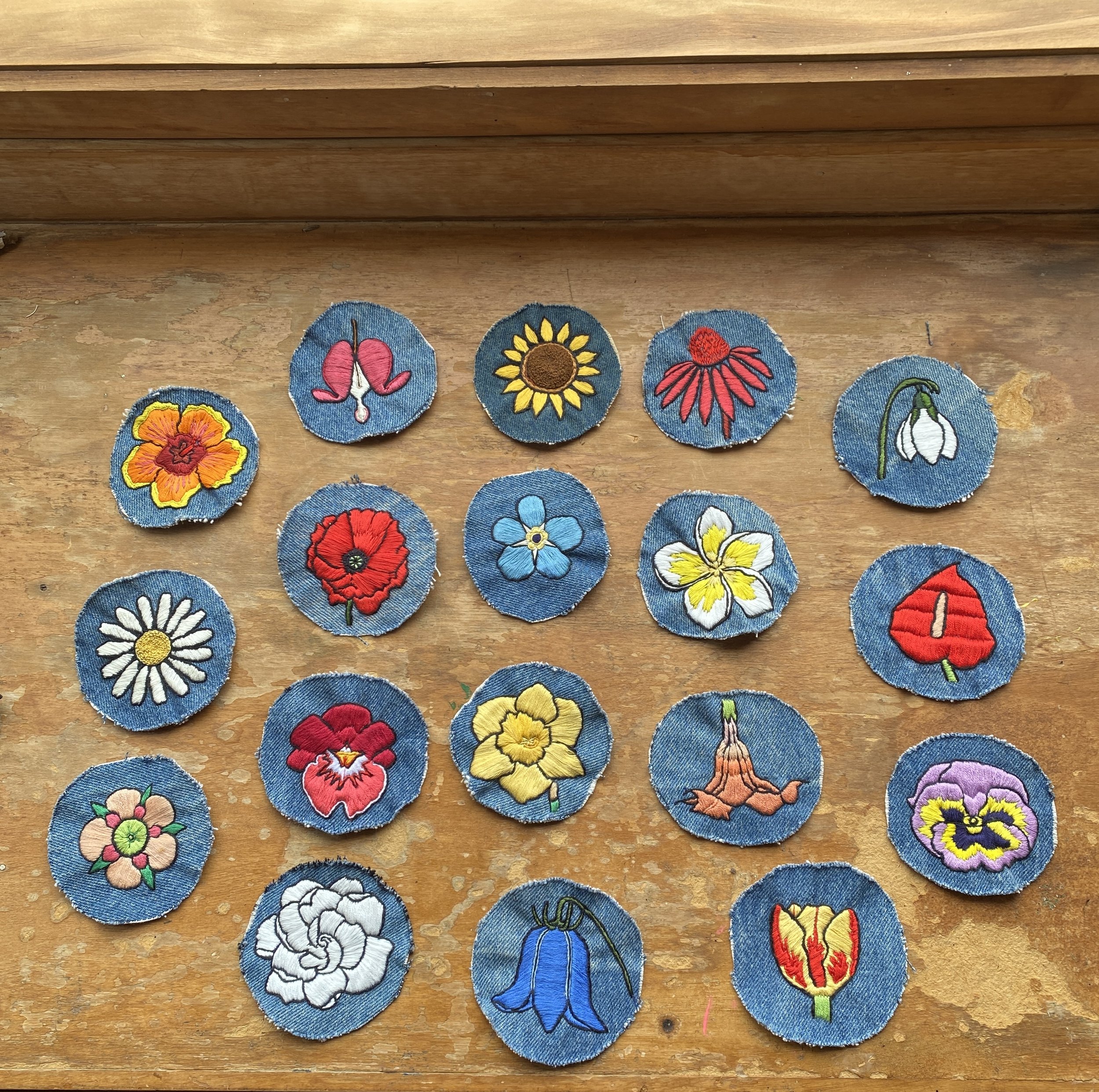 Hand- stitched flowers on upcycled denim. All one-off unique pieces.
